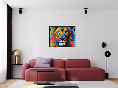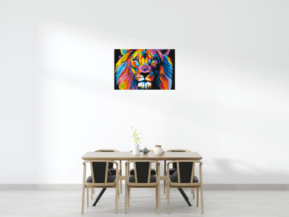 This art piece is not only aesthetically pleasing but is also rich in symbolism. The lion has long been a symbol of strength, courage, and nobility. In many cultures, it is seen as the king of the jungle and represents leadership and power. The pop art style adds a contemporary twist to this traditional symbol, making it a perfect piece for those who love to mix the old with the new.