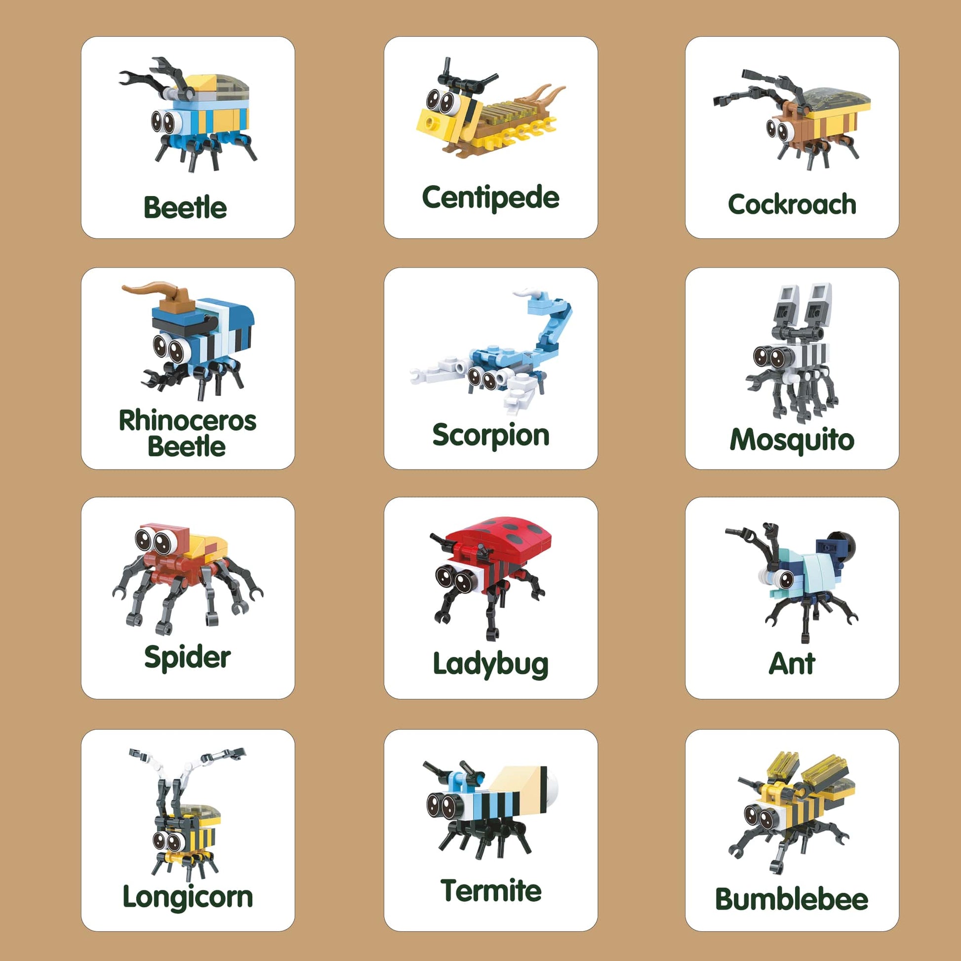 Includes: Beetle, Centipede, Cockroach, Rhinoceros Beetle, Scorpion, Mosquito, Spider, Ladybug, Ant, Longicorn, Termite, Bumblebee.