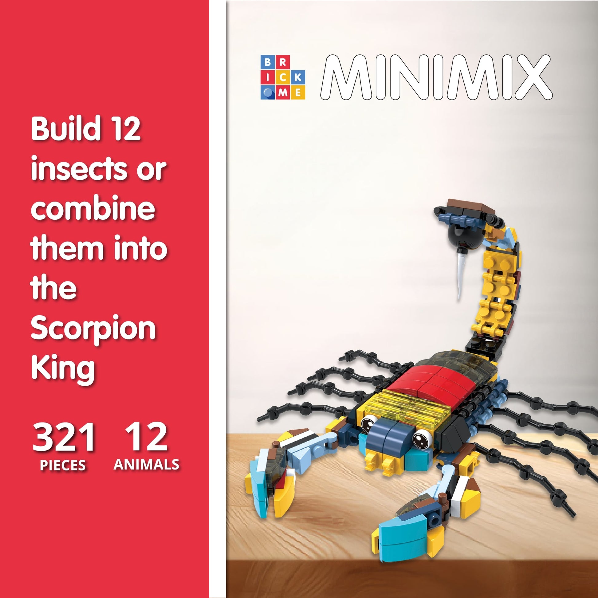 Creepy‑cool critters for curious builders. Make 12 mini bugs, or assemble the Scorpion King.