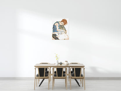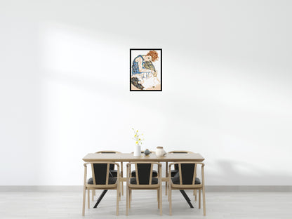 Woman Sitting with a Bent Knee is an oil painting created by the Austrian artist Egon Schiele in 1917. The painting is part of his series of works featuring his lover, Wally Neuzil, who is depicted in a seated pose with her back to the viewer, looking over her shoulder. Schiele's use of bold, expressive lines and vibrant colours create a striking image that captures the essence of his subject's sensual energy. This painting is considered one of Schiele's most iconic works and is a must-have for any art lover's collection.